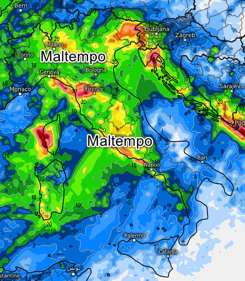 Maltempo su tutto il nord e il centro, Sardegna compresa, fino alla Campania con piogge e rovesci sparsi. Neve oltre i 1200-1400 metri sulle Alpi, localmente a quote inferiori nelle vallate strette soggette ad omotermia. Più asciutto il tempo in Abruzzo e al meridione (tranne la Campania). Nel pomeriggio attenuazione dei fenomeni al nord-ovest con qualche schiarita. Temperature in calo quasi ovunque, ma non farà freddo.