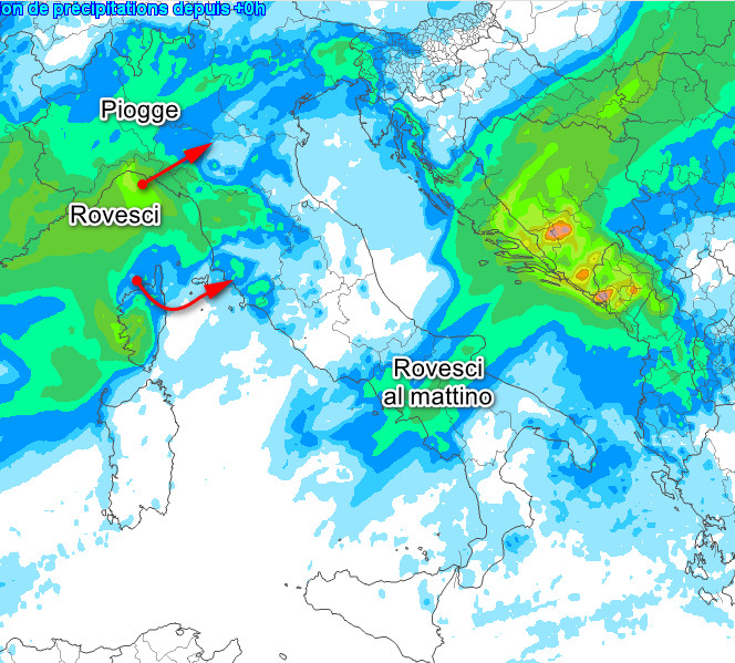 Rovesci anche intensi sulla Liguria con una probabile pausa nel pomeriggio. Parziale estensione delle piogge al Piemonte e alla Lombardia, sul resto del nord precipitazioni meno probabili. Rovesci al mattino tra Campania, Puglia e Lucania, ma in allontanamento verso levante, sul resto d’Italia precipitazioni meno probabili.
