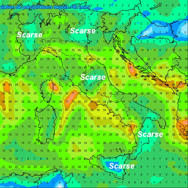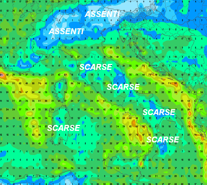 Piogge e nevicate in montagna abbastanza probabili soprattutto al centro e parte del meridione, dove si nota un millimetraggio più elevato. Piogge più scarse invece sul Piemonte, il Veneto, il Friuli, il settore ionico e buona parte della Sicilia centro-meridionale.