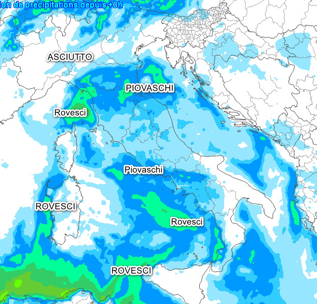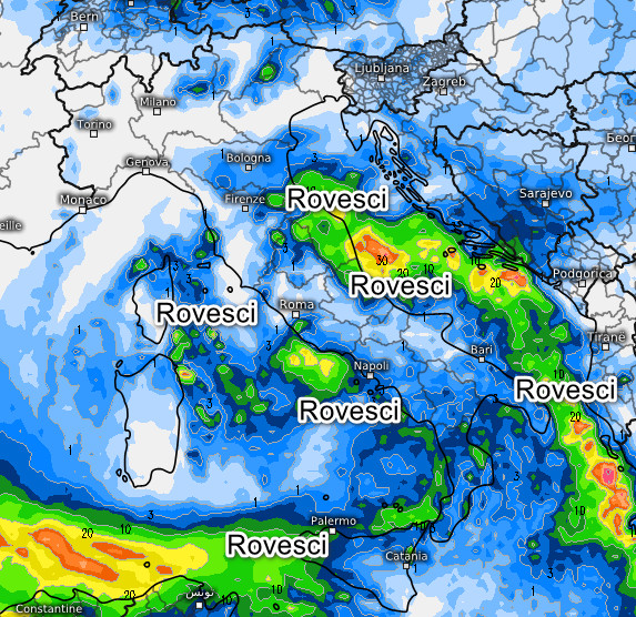 Rovesci anche consistenti lungo il versante adriatico fino alla Puglia. Rovesci anche tra le Isole e il medio-basso Tirreno. Qualche nevicata in Appennino sopra i 1200-1400 metri, tempo invece asciutto al nord a parte qualche piovasco sulla Romagna in via di attenuazione. Venti in ingresso da est in Valpadana e temperature in calo su gran parte del settentrione.