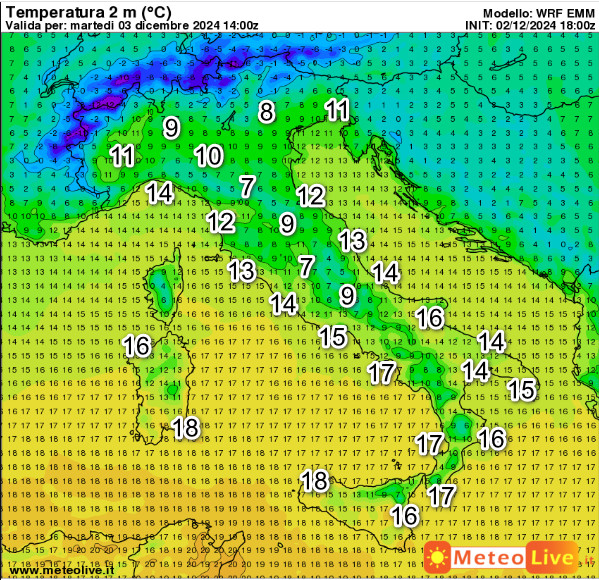 Sul fronte termico, queste sono le temperature attese in Italia alle ore 14 di martedi 3 dicembre: