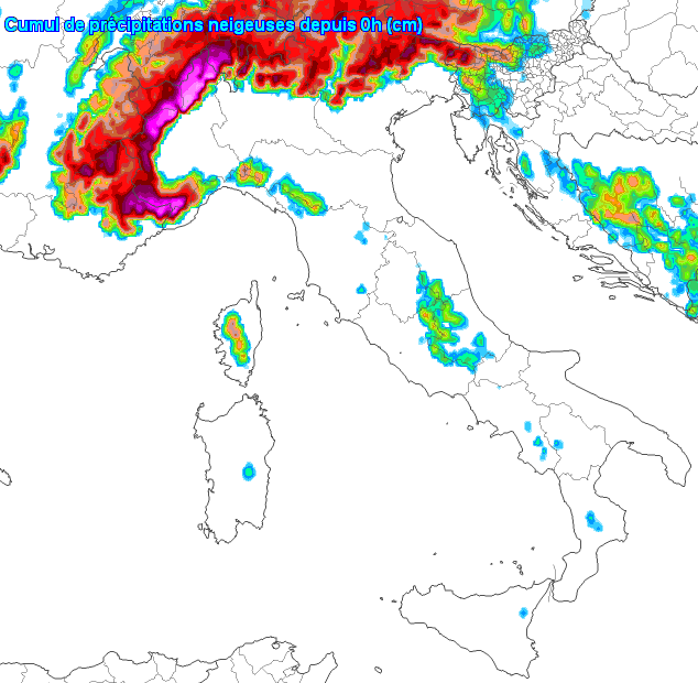Sulle Alpi l’apporto nevoso potrà raggiungere il metro di neve fresca aggiuntiva attorno ai 1600m e alle quote superiori, come mostra in maniera abbastanza lampante la mappa degli accumuli nevosi: