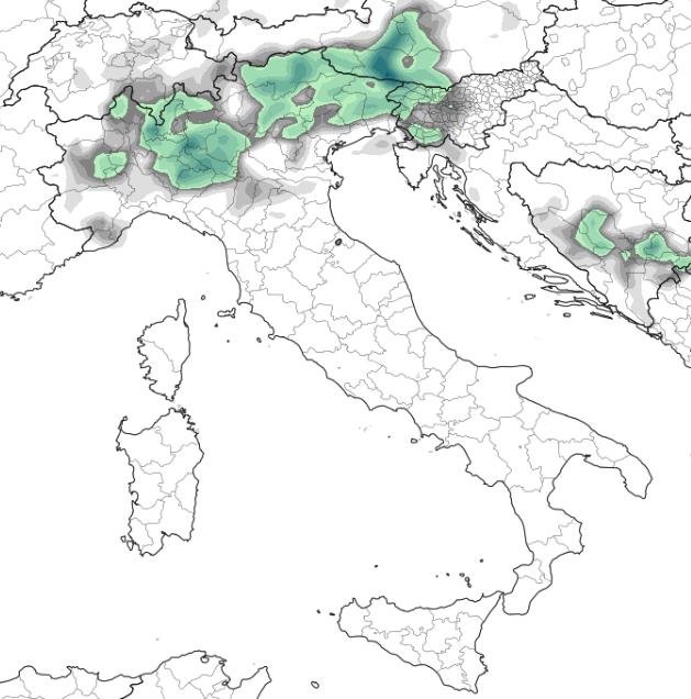 L’anticiclone non riuscirà a proteggerci adeguatamente almeno sino a lunedì 15, quando è prevista una fase di tempo migliore della durata di qualche giorno, pertanto tra sabato e domenica un impulso instabile valicherà le Alpi determinando alcuni rovesci anche temporaleschi, specie tra Lombardia e Triveneto, vediamo quelli previsti per sabato dal modello GFS: