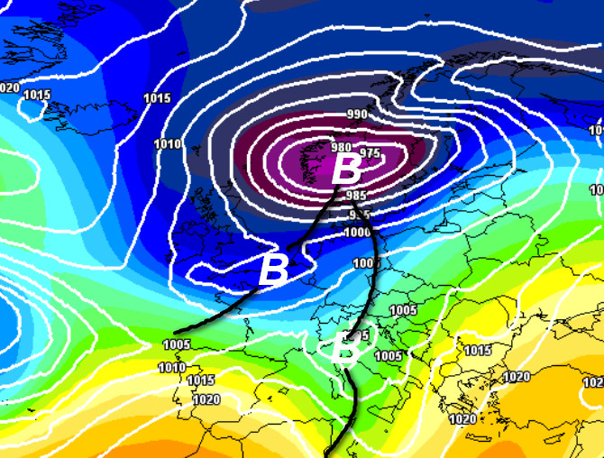 Ecco la perturbazione incastonata sui mari occidentali italiani. L’eventuale formazione di una depressione sul Mar Ligure (Genoa low) potrebbe fungere da freno per il fronte medesimo, rallentando il suo moto verso levante. In prossimità della Francia si nota una seconda perturbazione che potrebbe interessare l’Italia alla metà della settimana prossima, ma è davvero presto per parlarne adesso.