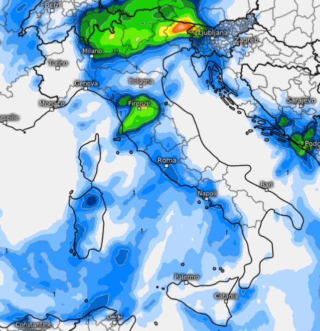 La seconda cartina mostra le precipitazioni attese in Italia nella MATTINATA di martedi 7 gennaio: