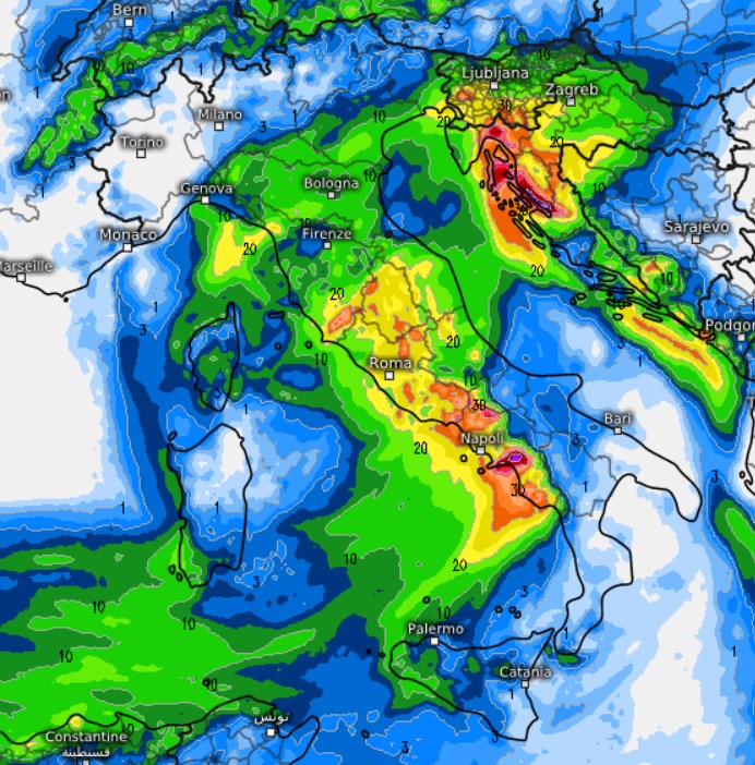 Probabili piogge abbondanti, a tratti sotto forma di nubifragio o temporale, su bassa Toscana, Lazio, Umbria e Campania, in pratica su gran parte delle regioni Tirreniche. Sul nord-ovest le piogge di martedì saranno probabilmente già cessate a partire dalla mattinata di mercoledì, forse ancora un po’ di pioggia residua sulla Lombardia.