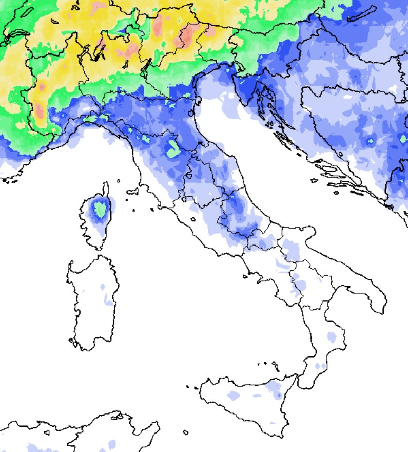 Ecco la probabilità di pioggia vista dal modello ECMWF per il pomeriggio del 2 giugno, in verde e soprattutto in giallo la probabilità più elevata, interessate principalmente Alpi, Prealpi e alte pianure: