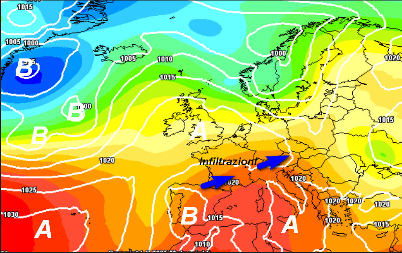 Come evidenziato dalla carta, l’imponente struttura anticiclonica avrà esteso il suo dominio su tutto il bacino del Mediterraneo, fungendo da scudo protettivo e garantendo condizioni di tempo stabile, soleggiato e decisamente caldo sul Centro e sul Sud Italia. Le regioni settentrionali, invece, o per meglio dire alcuni loro settori, si troveranno ai margini di questa fortezza anticiclonica e verranno lambite da infiltrazioni di aria più fresca e umida di origine atlantica. Queste correnti potrebbero innescare lo sviluppo di attività temporalesca, soprattutto nelle ore più calde della giornata e a ridosso dei rilievi.
