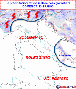 Diamo anche un cenno alla giornata di domani, domenica 10 giugno. Al mattino avremo qualche piovasco sulla Puglia in via di attenuazione, mentre nel pomeriggio-sera si affaccerà qualche temporale sulle Alpi.
