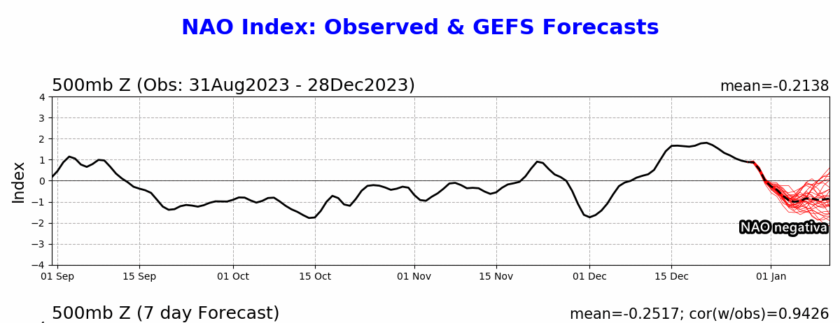 A seguire, tra prima e seconda decade di gennaio, potrebbe esserci con alta probabilità un cambio di segno, ovvero potremmo osservare una NAO neutra o negativa, che significherebbe una maggior invadenza delle alte pressioni sul nord Atlantico con maggior possibilità di freddo in Italia.