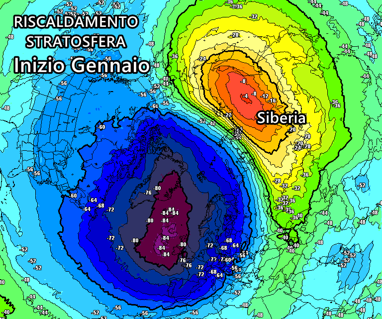 Il riscaldamento alle altissime quote, oltre i 15 km di altezza, è già in atto in queste ore ma tenderà ad intensificarsi nei primi giorni di gennaio. Si tratta più precisamente di uno stratwarming siberiano, ovvero un riscaldamento della colonna d’aria stratosferica in direzione della Siberia, una situazione che tende a verificarsi negli inverni in cui questi territori si raffreddano fortemente al suolo. La formazione di un vasto campo di alta pressione termica sulle pianure siberiane, con temperature glaciali, favorisce la formazione di stratwarming in stratosfera.