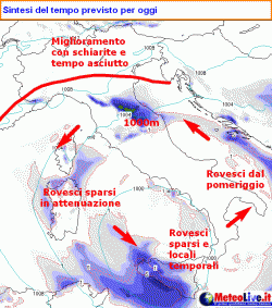 SITUAZIONE: un vortice di bassa pressione staziona sulle nostre regioni centro-meridionali, dove rende attive condizioni di generale instabilità atmosferica. Il tutto origina rovesci a carattere sparso, locali manifestazioni temporalesche, isolate e brevi grandinate e nevicate qua e là in montagna a partire dai 1000-1300 metri. Al nord invece la pressione è prevista in incipiente rialzo, il che favorirà lo sviluppo di schiarite, specie al nord-ovest.