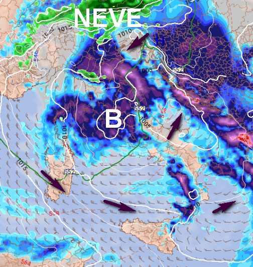 Notate in verde anche la spruzzata sull’Appennino emiliano e in viola il maltempo sull’Emilia-Romagna e le regioni centrali tirreniche, il tutto in un contesto ventoso e fresco, con temperature che piomberanno al di sotto delle medie del periodo, specie sulle regioni di nord-est, investite in pieno dalla Bora.