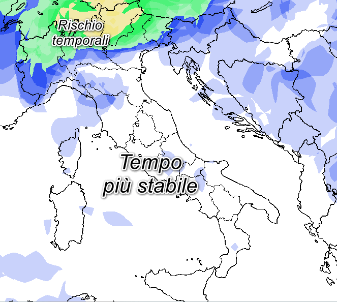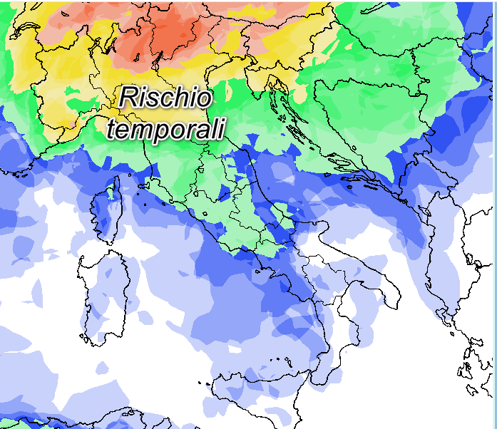 Come evidenziato dai modelli, le aree più esposte saranno quelle settentrionali, in particolare l’arco alpino e le alte pianure, dove la probabilità di fenomeni localmente intensi risulterà medio-alta – In blu probabilità di pioggia bassa (sotto al 25%), in verde medio-bassa (fra 25 e 50%), in giallo medio-alta (fra 50 e 75%) e in rosso alta o molto alta” (oltre il 75%).