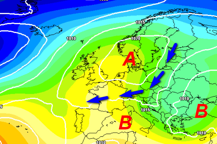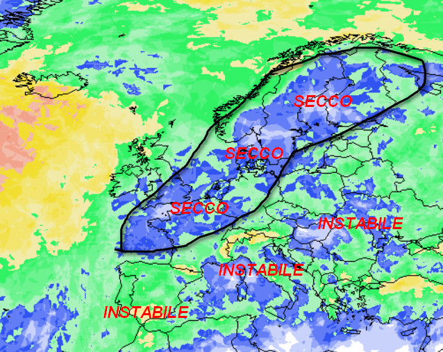 La fascia secca, ovvero dove dominerà l’alta pressione e il bel tempo, si disporrà tra l’Europa centrale e la Scandinavia. Più a sud avremo un ritorno di correnti fresche da est che riporteranno un clima instabile sulla nostra Penisola, accompagnato da rovesci e temporali che si renderanno protagonisti segnatamente nelle zone interne e nelle ore pomeridiane, ma senza escludere locali sconfinamenti verso le pianure e le coste.