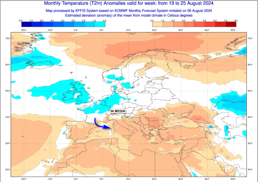 La prima mappa mostra le anomalie termiche in Europa fino a domenica 11 agosto: