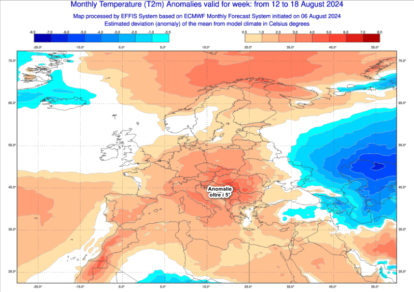 Volgiamo ora lo sguardo al lasso temporale compreso tra il 12 e il 18 agosto, ovvero la settimana di Ferragosto. Questo è il quadro delle anomalie termiche a scala europea per il periodo un oggetto: