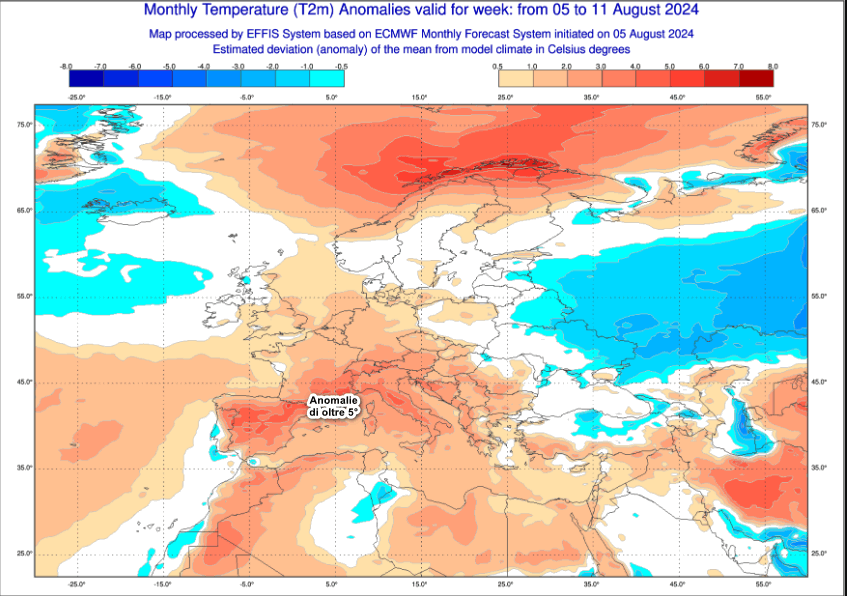 Dove vedete il colore rosso le anomalie termiche saranno oltre 5° superiori ai valori medi stagionali. Di conseguenza l’Italia ed i Paesi dell’Europa Meridionale saranno ancora avvolti da una calura opprimente che non darà tregua.