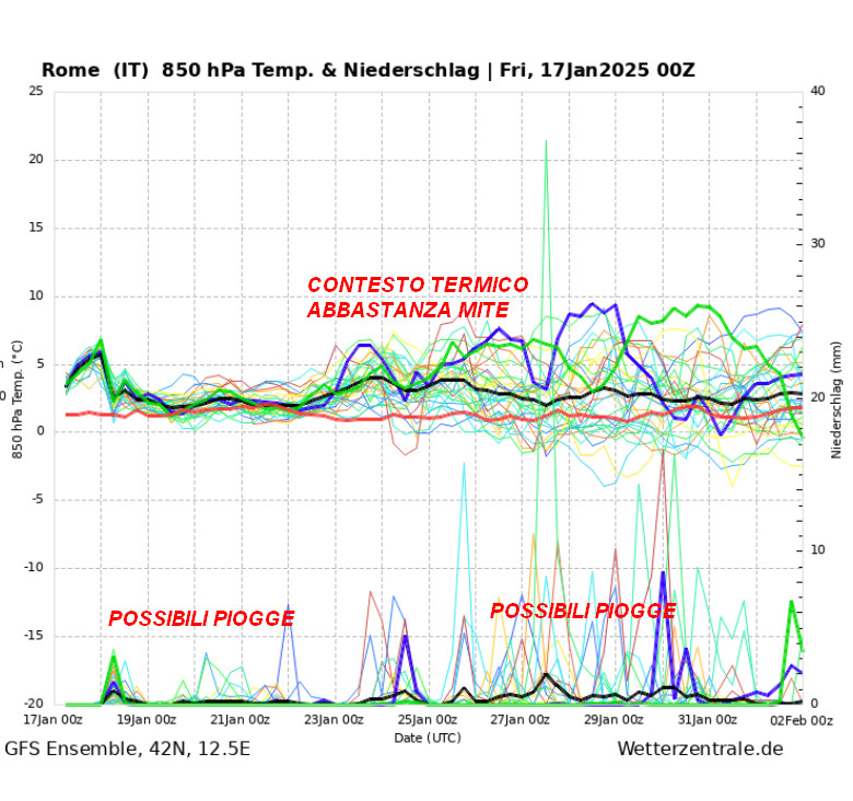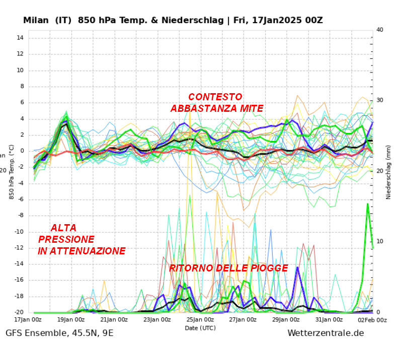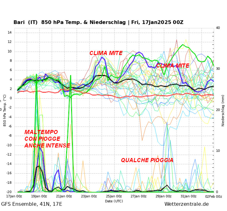 Quelli che vedete sono chiamati “spaghetti” e riassumono tutte le corse del modello GFS, compresa ovviamente quella ufficiale. La corsa ufficiale è rappresentata dalla linea verde. Le linee a metà grafico sono le temperature a 1500 metri di quota e la linea rossa è la media. I picchi che si notano più in basso sono invece le precipitazioni. Più i valori sono alti, più le piogge (o le nevicate) sono probabili e intense. I punti geografici di riferimento sono situati sulla verticale delle città di MILANO, ROMA e BARI.