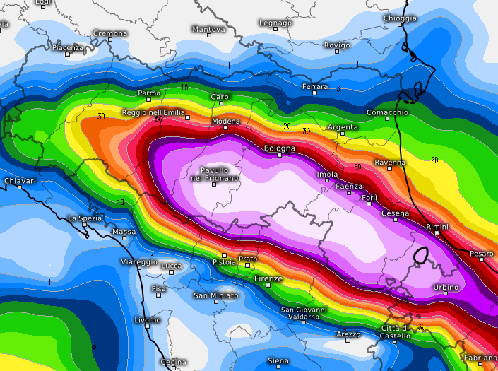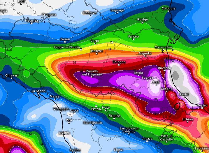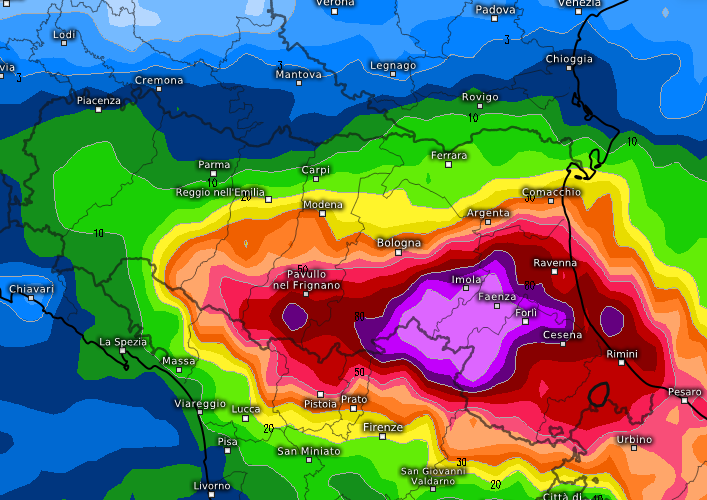 Nella terza ed ultima mappa una previsione leggermente meno drammatica, ma sempre preoccupante, specie tra Imola, Faenza e Forlì, piogge sempre abbondanti ma con accumuli appena sotto i 100mm: