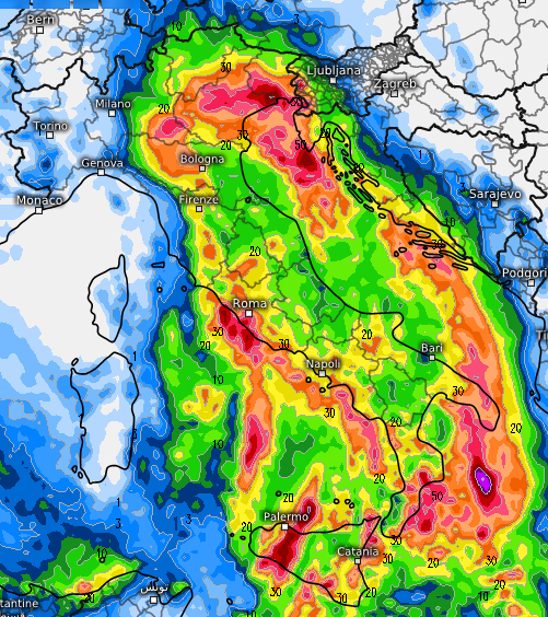 Su scala nazionale la distribuzione dei fenomeni sarà con buona probabilità quella che vi mostriamo qui sotto, con molta pioggia su tutto il centro-sud (Roma e Napoli comprese) e sino al nord-est, anche se gli accumuli più rilevanti sono attesi in mare aperto sullo Jonio: