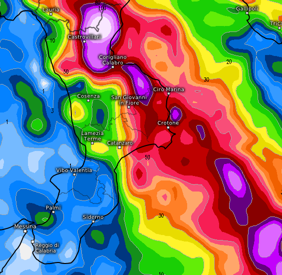 Nel corso di domenica 20 e anche nella giornata successiva però i fenomeni potrebbero accanirsi con forza sulla Calabria jonica, favorendo alluvioni lampo tra Crotone, San Giovanni in Fiore, Corigliano Calabro e Castrovillari con circa 150-200mm attesi in poche ore: