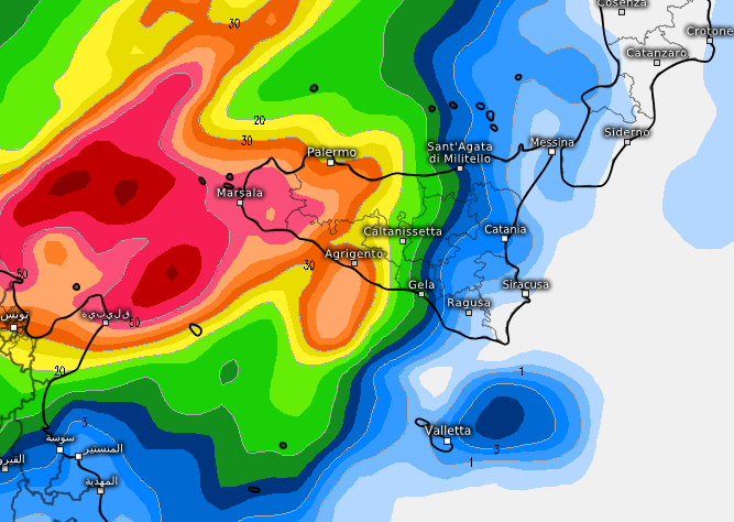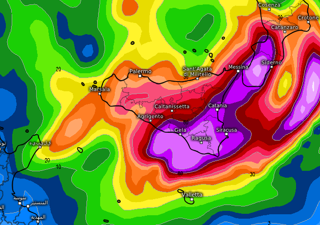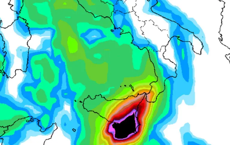 Un violentissimo nubifragio con accumuli di oltre 70mm in poche ore, secondo il modello GFS, potrebbe colpire la Sicilia da ovest verso est, ma con maggiori accumuli tra Ragusa e Siracusa, anche se nessuna provincia dovrebbe essere risparmiata da questo grappolo temporalesco molto intenso.