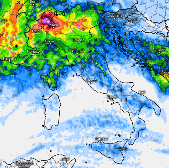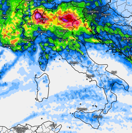 Sono attesi accumuli di pioggia anche superiori ai 150mm in 24 ore con rischio di nubifragi sino a giovedì mattina soprattutto su alta pianura lombarda, Biellese, Cusio, Ossola, zona laghi lombardi, Canton Ticino, specie Locarnese, Comasco, Lecchese, Varesotto, basso Trentino, zona del Garda, Prealpi Venete, Vicentino, Veronese, Padovano, zona dei Colli Euganei soprattutto, e poi Veneziano.