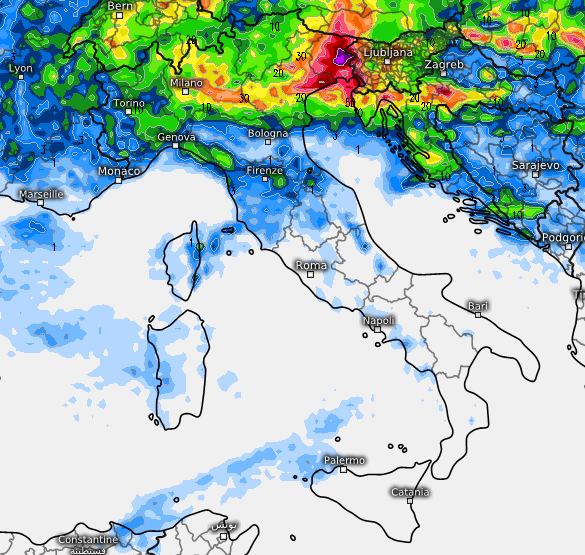 Nella seconda parte di giovedì e sino a venerdì ancora colpito il nord-est con precipitazioni anche abbondanti su tutto il Friuli Venezia Giulia e ancora fenomeni residui a spasso per la Valpadana.