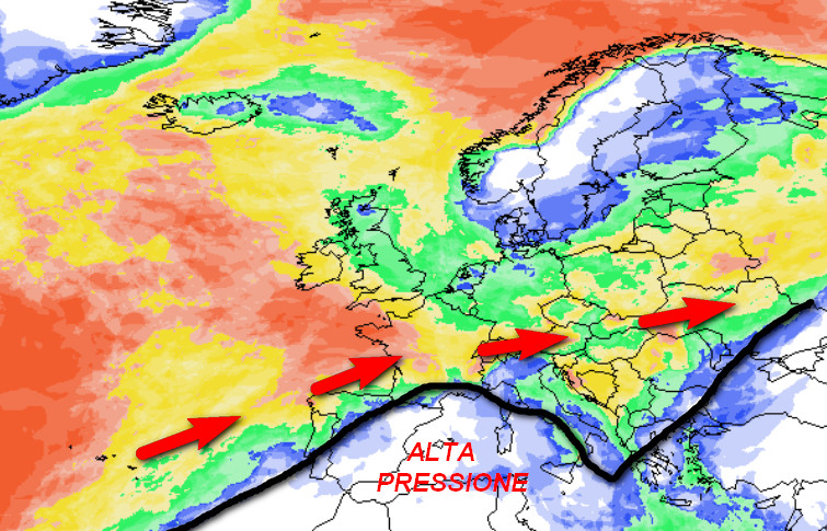 Ancora condizioni di variabilità sull’Italia, in un contesto poco freddo e con una probabilità MEDIA di avere piogge al centro e sul basso Tirreno. Le correnti occidentali miti (frecce rosse) avranno però le ore contate in quando su tutto lo scacchiere atlantico si paleserà una rimonta dell’alta pressione che probabilmente diverrà realtà a meta mese. Ribadiamo anche in questa sede che la previsione a medio e lungo termine risulta tuttavia davvero complicata, in quanto ancora non ci è dato sapere quanto esattamente sarà invadente la rimonta anticiclonica sopra menzionata sul Mediterraneo.