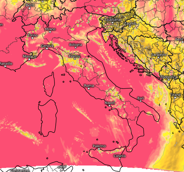 La giornata di mercoledi 3 settembre trascorrerà invece abbastanza tranquilla dal punto di vista meteo. Questo è il soleggiamento totale cumulato previsto tra le 9 e le 16 di mercoledi 3 settembre (rosa molto soleggiato, giallo nubi e schiarite, grigio scuro assenza di sole):