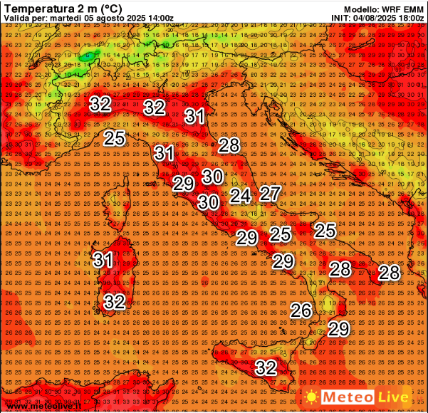 Temperature ancora ampiamente accettabili anche se in lieve aumento rispetto agli ultimi giorni. Punte di 32° saranno possibili in Valpadana, sulla Sicilia e sulla Sardegna.