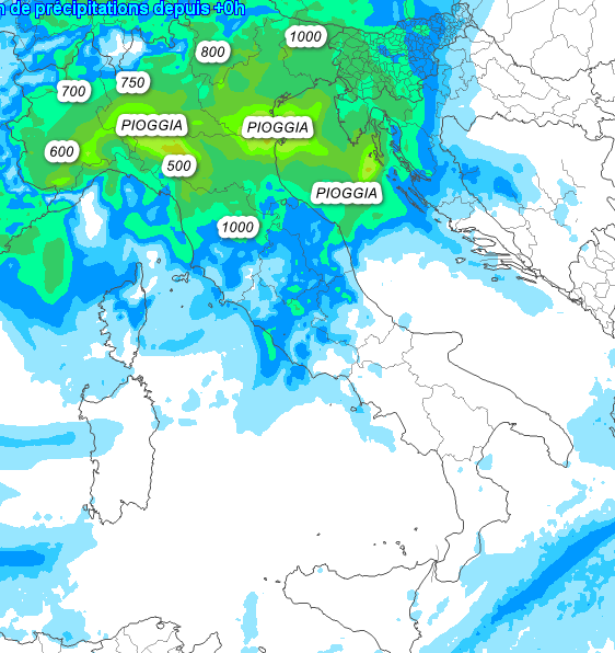 Si nota molto bene l’aria fredda in discesa sulla Francia e l’invorticamento della stessa tra il Mar Ligure e l’alto Tirreno. Questa depressione resterà praticamente sul posto nelle prossime 36-48 ore, rinnovando il maltempo al nord e su parte delle regioni centrali, con neve anche a bassa quota specie al settentrione. La prima mappa mostra la sommatoria delle precipitazioni attese in Italia fino alle 24 della prossima notte: