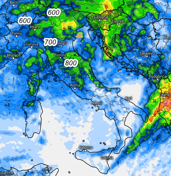 Quota neve sui 500-700 metri tra Appennino Ligure e settentrionale, 600-700 metri sulle Alpi centro-occidentali, 800-1000 metri sull’estremo nord-est. Rovesci anche al centro, ma con quota neve più alta, tra 800 e 1000 metri. Al sud e sulle Isole ampie schiarite ed assenza di fenomeni.