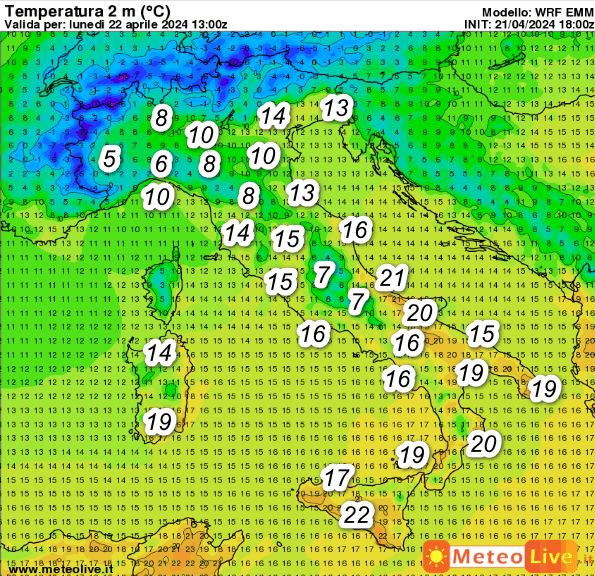 Valori molto bassi al nord-ovest, quasi ovunque sotto i 10°. Temperature abbastanza basse anche al nord-est, più elevate sul resto d’Italia con punte di 20-22° sulle regioni estreme e sulla Sicilia.