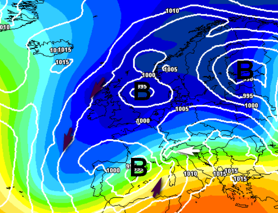 L’aspetto più importante però è l’impianto barico generale, che il modello sembra aver colto con buona affidabilità, visto che anche la media di tutti gli scenari proposti punta sul tempo perturbato, come si nota qui sotto: