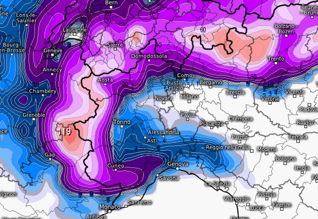 Come si nota, deboli nevicate raggiungerebbero addirittura la pianura piemontese occidentale e sud occidentale e il sud Pavese, mentre sulle Alpi oltre i 1.500-1.800m il modello prevede oltre 1 metro di neve fresca e di ottima qualità, specie sui versanti Francesi.