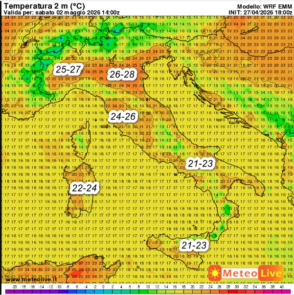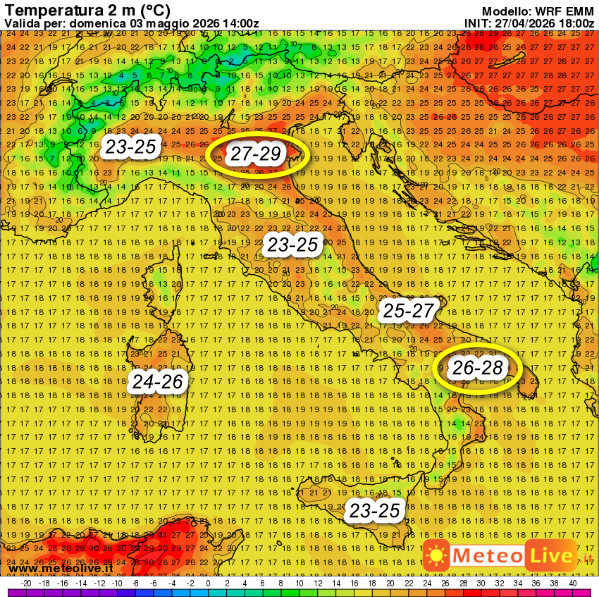 Nuovo aumento termico sulle pianure del settentrione, con punte fino a 26-28° sul settore orientale. Nuovamente caldo anche in prossimità delle pianure interne tosco-laziali con 24-26°; tra 22 e 24° le temperature previste nelle aree interne della Sardegna, mentre le regioni meridionali risentiranno ancora di refoli più freschi da nord ed avranno temperature massime più gentili.