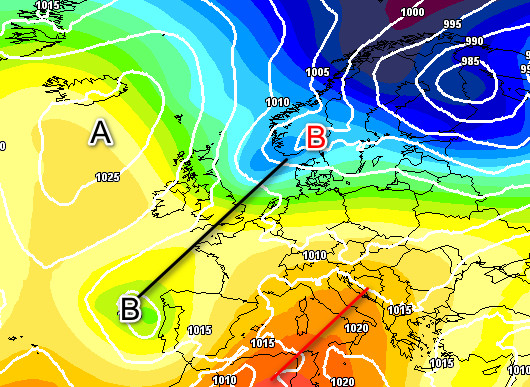 Immaginate l’asse portante di questa imponente struttura atmosferica (quella linea rossa che vedete nella mappa) iniziare a flettersi, quasi piegandosi verso levante. Cosa significa in termini pratici per il nostro meteo? Che la sua forza stabilizzante diminuirà gradualmente, incalzata e messa sotto pressione dall’incalzante “lavorìo depressionario” e piovoso che si sta organizzando tra l’Europa occidentale e settentrionale.