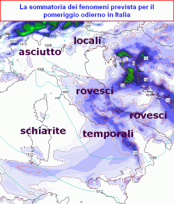 OGGI: al nord-ovest passaggi nuvolosi medio alti, in un contesto almeno in parte soleggiato e asciutto. Sul nord-est nuvolosità irregolare con possibili piogge o nevicate oltre i 1800m sui settori altoatesini di confine e locali spunti temporaleschi nel pomeriggio a macchia di leopardo. Sul resto del Paese tempo molto instabile con rovesci e spunti temporaleschi sparsi, specie nel pomeriggio e sulle zone interne, più sole su nord Sardegna, Sicilia ed estremo sud. Locali grandinate sulle zone interne appenniniche. Temperature in lieve aumento, moderato al nord-ovest, ma clima ancora fresco su gran parte del Paese.