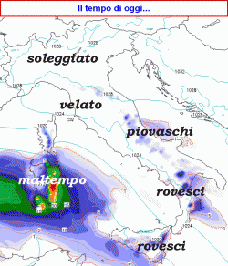 OGGI: sulla Sardegna peggioramento con piogge e temporali, specie sull’est dell’isola con probabile fusione della neve in Barbagia. Nuvolosità irregolare sul resto del centro e del sud, con maggiori schiarite sui versanti tirrenici e nubi basse e qualche pioggia su medio e basso Adriatico, rovesci sparsi su settore jonico e Sicilia centro orientale. Temperature in lieve aumento al nord nei valori massimi, in moderato aumento altrove per venti forti da ESE, con raffiche sulle coste sarde.