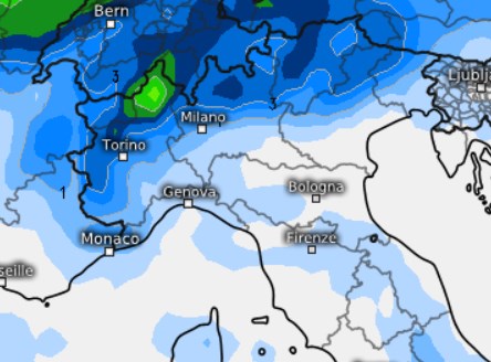 Nelle zone in verde e blu scuro saranno più probabili BREVI temporali nel pomeriggio-sera, che tuttavia potrebbero risultare anche violenti e con brevi grandinate. Si tratta delle zone fra i rilievi dell’alto Torinese e il Verbano (alto Piemonte), Alpi Lombarde e Trentino Alto Adige. Probabilmente coinvolto solo l’estremo nord del Veneto.