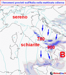 SITUAZIONE ATTUALE: una depressione si va ormai localizzando tra basso Adriatico e Jonio e ancora per qualche ora determinerà tempo instabile su medio Adriatico e meridione con limite della neve tra 700 e 900m, rovesci sparsi, vento e temperature in calo. Altrove intervallo soleggiato, serenissimo al nord-ovest.