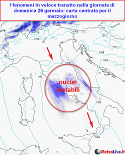 EVOLUZIONE: domenica un nuovo veloce impulso instabile transiterà da nord verso sud, con effetti soprattutto al centro-sud, ma con rovesci passeggeri, localmente nevosi in Appennino oltre i 700-900m. Lunedì nuova figura depressionaria in formazione sul centro Italia con neve dalla sera su Emilia-Romagna e Triveneto, al centro a quote molto basse, al sud attesi temporali sul basso Tirreno.