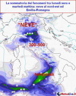 Tempo migliore altrove. Domenica veloce transito di un nucleo instabile da nord con effetti dapprima al centro, poi sul meridione, un po' di neve anche sui crinali alpini di confine. Lunedì graduale peggioramento al centro-sud e sul nord-est con neve in pianura tra la sera e martedì mattina su Emilia-Romagna e Triveneto, a 300-500m sulle zone interne del centro, temporali sul basso Tirreno. Mercoledì maltempo in arrivo al centro con neve all'interno, freddo e qualche fiocco al nord.