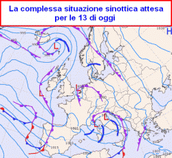 La cartina sinottica che vedete poco sopra è valida per le ore 13 della giornata odierna. E’ una situazione meteorologica molto complessa, che vede la presenza di due minimi ad occhiale, uno sul Mar Ligure e l’altro sull’alto Adriatico. Il sistema frontale, ormai occluso, si avvita attorno ad essi e tende ad evolvere verso levante con estrema fatica.