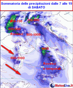 Come detto poco sopra, il corpo nuvoloso in questione evolverà verso levante molto lentamente. Di conseguenza avremo precipitazioni sparse su gran parte delle nostre regioni, anche a carattere di rovescio sul medio–basso Tirreno e la Sicilia.