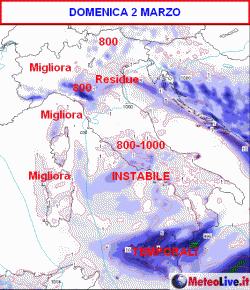 Oggi tempo perturbato su gran parte d'Italia, con neve a bassa quota sul nord-ovest, in successivo rialzo. Domenica migliora su gran parte del nord e sull'alto Tirreno, ancora tempo instabile altrove. Lunedì nuovo peggioramento al centro-nord con pioggia e neve sulle Alpi.