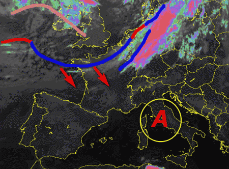 Osservate però la perturbazione in alto a sinistra. Questa avrà un’azione di maglio nei confronti del tessuto anticiclonico ed inizierà ad interessare le regioni settentrionali nel pomeriggio di domenica.