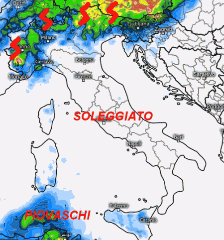 Al mattino il tempo sarà bello quasi ovunque. Nel pomeriggio e in serata la perturbazione sopra citata si addosserà alle Alpi provocando qualche temporale in loco con parziali sconfinamenti verso le aree di pianura adiacenti. Qualche piovasco si attiverà anche all’estremo sud e sulla Sardegna meridionale, per il resto nessun cambiamento.